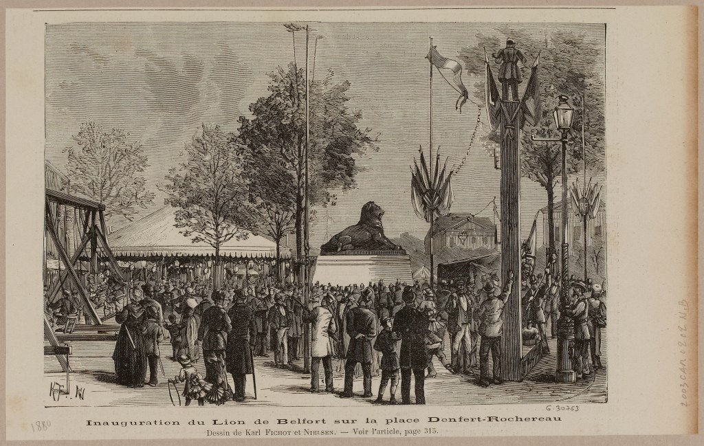 Concernant sa participation à l’installation de la copie du « Lion de Belfort », par Auguste BARTHOLDI, sur la Place Denfert-Rochereau, je n’en ai pas explicitement trouvé trace dans son dossier. Mais c’est fort possible d’autant plus qu’il a participé, en 1878, à l’amélioration de la place d’Enfer qui devient à cette époque la Place Denfert-Rochereau, du nom de l’officier supérieur et député, célèbre pour avoir dirigé la défense de Belfort durant la guerre franco-allemande de 1870. Lors du Salon de sculpture de 1878 à Paris, Auguste BARTHOLDI expose un modèle en plâtre, réplique réduite au tiers de la taille du Lion original, sculpté dans la roche à Belfort. Sur la proposition de VIOLLET-LE-DUC, les élus de la Capitale retiennent le principe de faire exécuter pour Paris une reproduction du modèle, en cuivre repoussé. Le Conseil municipal l’acquiert en 1880 et souhaite l’installer aux Buttes-Chaumont mais la pétition des habitants du 14e arrondissement, argumentant qu’il a été un des plus éprouvés pendant le siège, décide de sa place définitive, place Denfert-Rochereau. Ce qui est certain, c’est que Charles a dû assister à l’inauguration du Lion et qu’avec toute sa famille, il a sûrement participé à la fête du 14 juillet 1880 (année où le jour de la fête nationale a été décrété) sur la Place Denfert Rochereau, autour du Lion.