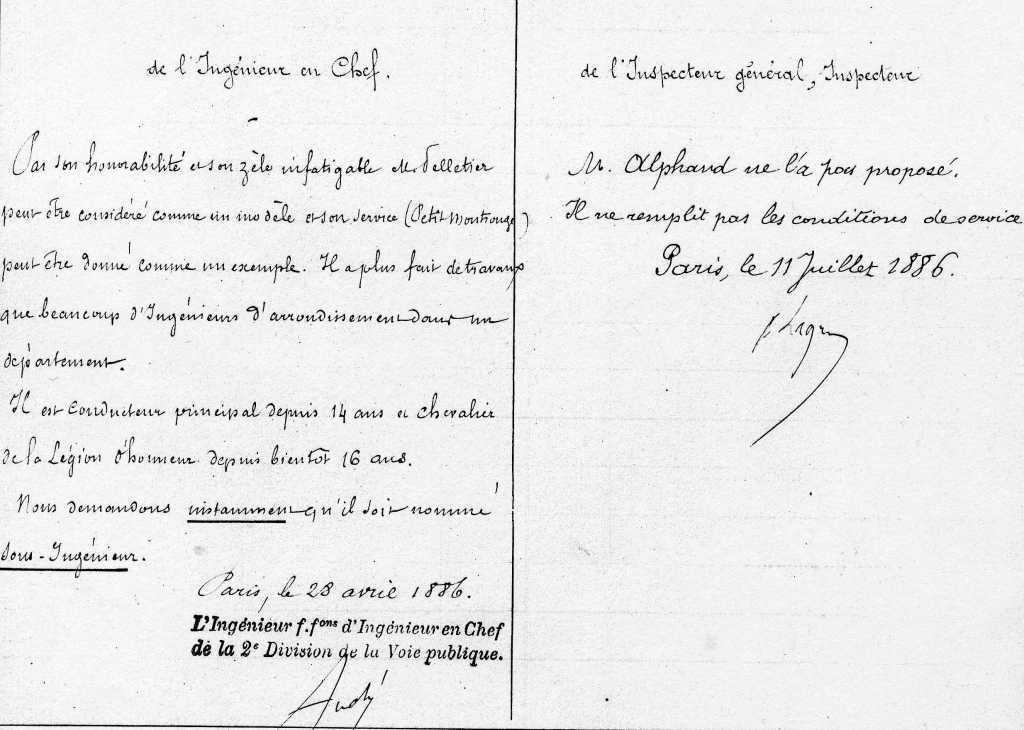 C’est à partir de 1854 qu’il est conducteur embrigadé (fonctionnaire) et que son dossier contient régulièrement des fiches annuelles résumant son travail avec les annotations, portées par ses supérieurs qui sont toujours très élogieuses tout en soulignant ses points plus faibles.