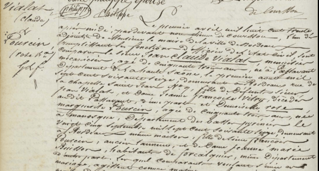 Puis un jour, je découvre que mes deux tourtereaux se sont mariés à Bordeaux… le 1er avril 1830 ! Et ce n’est pas une blague, j’ai bien trouvé leur acte de mariage.