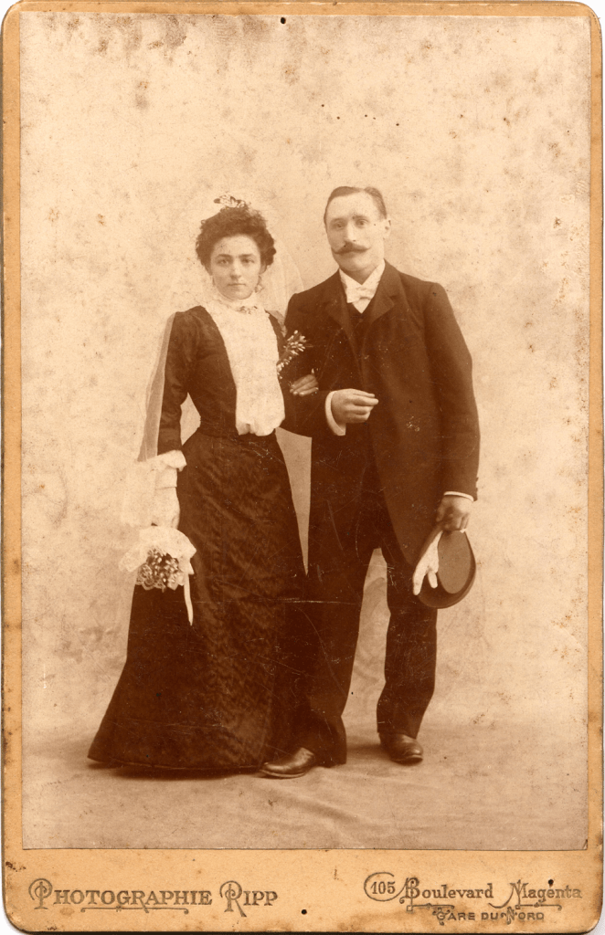 Je me doute que c’est sûrement ta rencontre avec Désiré Armand Bernard FRERET qui deviendra ton époux et mon grand-père qui t’a amenée à arrêter ce travail. Tu es une bien jolie jeune femme sur cette photo de vous deux, prise le jour de votre mariage, le 25 novembre 1902.