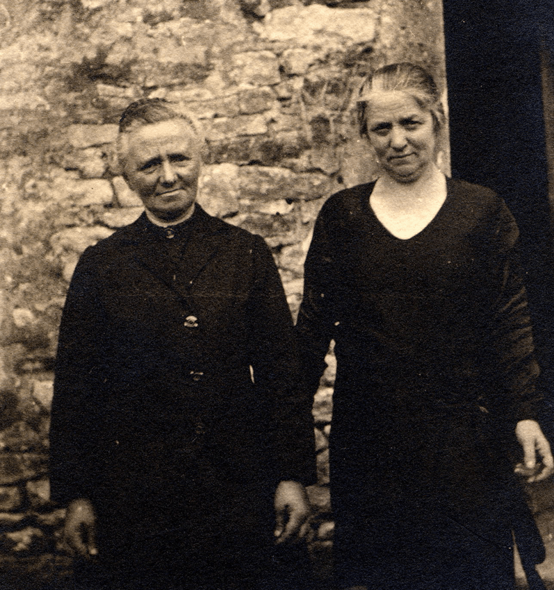 Des liens que tu as gardés avec ta famille, je sais juste que tu es proche de ta sœur Marie Louise avec qui tu échanges des cartes postales dans laquelle elle parle de venir vous voir. Elle s’est mariée avant toi, en 1898, à Laval, avec Armand Honoré RABIER. Ils ont une fille, Germaine Yvonne Amandine dont tu es la marraine et qui semble beaucoup t’aimer. Et le 30 mars 1911, c’est elle qui sera la toute jeune marraine de votre petit Jean. J’ai cette photo prise, vers 1910, sans doute chez ta sœur, à Laval. Vos coiffures identiques m’ont amusée.