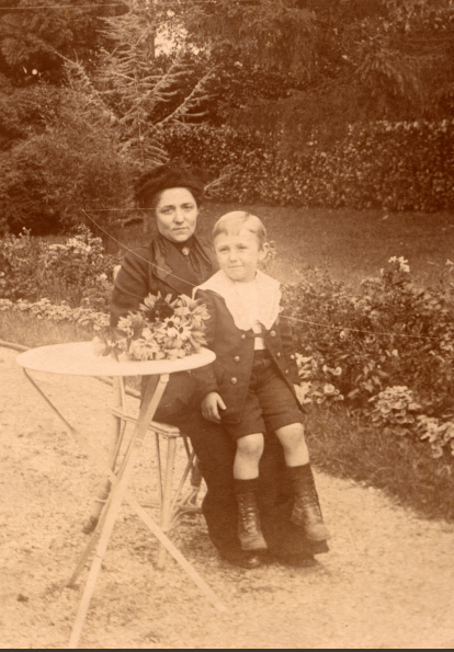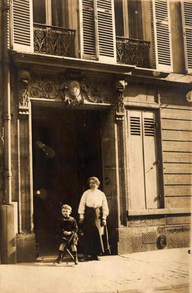 Quand Désiré part à la guerre, la vie ne devait pas être simple pour toi, ton travail de concierge étant très peu rémunéré. Heureusement, tu as trouvé du soutien auprès de la famille de Désiré, dans la Manche, chez qui tu vas assez souvent avec ton petit Jean, comme en témoigne les cartes que Désiré envoie à son petit garçon, tout au long de la guerre. De cette période j’ai cette photo avec ton petit Jean, dans une cour intérieur du 9 rue Roquépine où vous habitez.