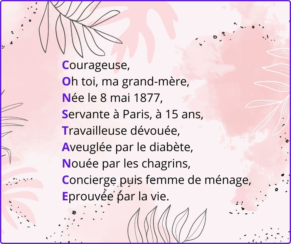 Combien ta vie aura été une succession d’épreuves qui t’ont minée peu à peu, ne te laissant pas la joie de connaître tes deux petits-enfants ! Tu seras sans doute heureuse de savoir que mon second prénom est le tien. J’ai du mal à imaginer quelle grand-mère tu aurais été. Une grand-mère qui fait des câlins, je ne pense pas. Pour en donner, je crois qu’il faut en avoir reçu et la vie n’a vraiment pas été tendre avec toi. Une grand-mère avec qui apprendre à cuisiner, peut-être ? Tout ce que je sais, c’est que tu étais la championne incontestée du riz au lait. Quand ma mère en faisait, j’entends encore mon père, dire à chaque fois : « Il est bon mais pas aussi bon que celui que ma mère me faisait ! » Une grand-mère qui lit des histoires, joue et bricole ? Ta vie, faite de dur labeur, ne t’a sûrement pas laissé de temps pour découvrir ces loisirs. Alors dans mon cœur et mes pensées, tu seras ma grand-mère courage.