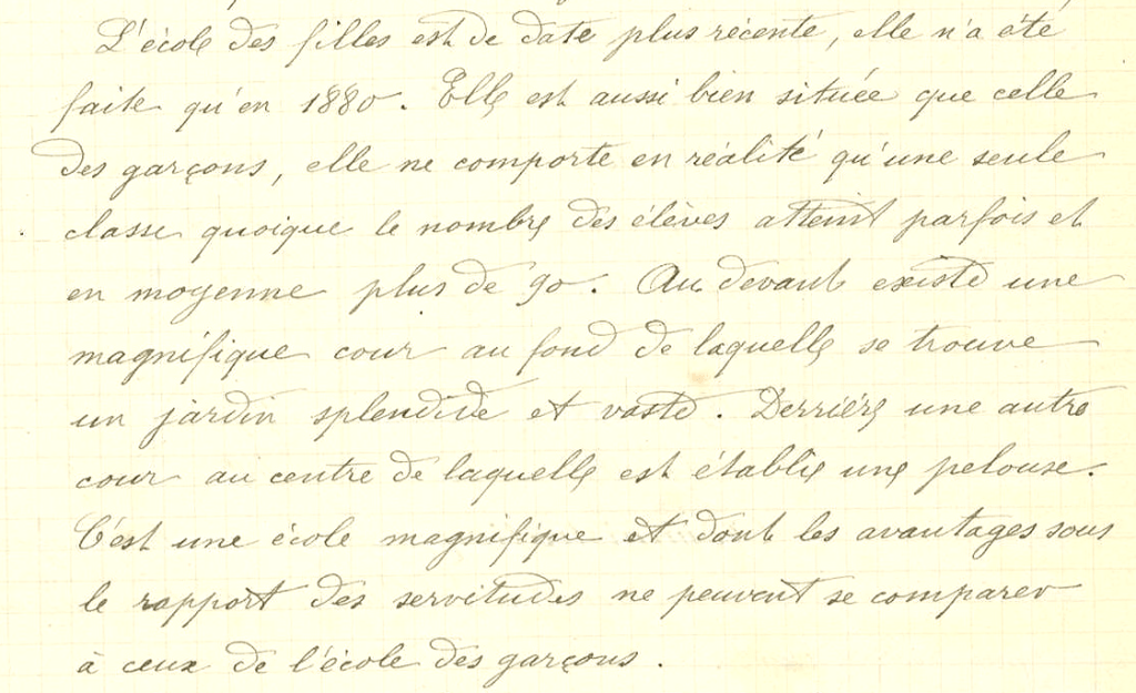 Tu as 6 ans en 1883, l’école est obligatoire depuis l’année précédente. Tu n’as pas loin pour y aller car La Richardière est proche du bourg où se trouve l’école des filles qui est toute neuve, plus récente que celle des garçons. Dans la monographie de la commune, écrite en 1899, l’instituteur dit qu’elle est magnifique.