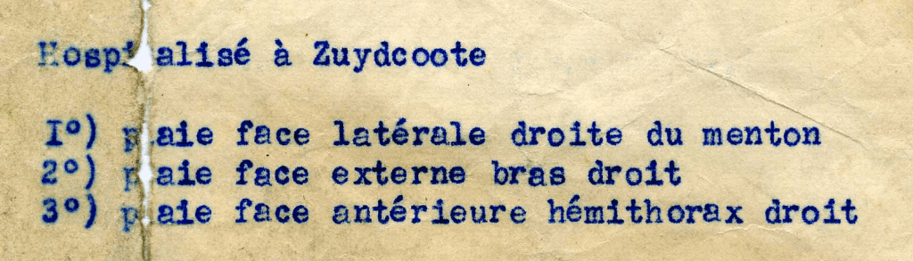 Le 31 mai 1940, il est pris dans la Poche de Dunkerque, entre les tirs allemands et les tirs anglais. Il est gravement blessé, fait prisonnier et hospitalisé à Zuydcoote puis à l’hôpital Saint-Ruth de Lille. Si mon père ne parlait pas beaucoup de sa vie d’autrefois, j’ai su, dès l’enfance qu’il a été gravement blessé et a failli perdre la vie ce jour-là. C’était gravé dans son corps par des cicatrices.