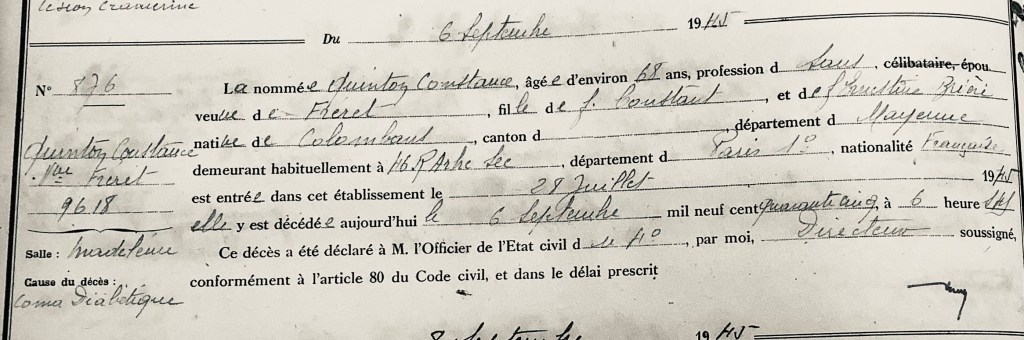 Maman t’a soignée comme si tu étais sa mère. Mais tu étais trop malade et le 28 juillet 1945, tu dois à nouveau être hospitalisée, cette fois-ci, à l’Hôtel-Dieu. Et hélas, tu n’en sortiras pas. Tu y décèdes le 6 septembre 1945 d’un coma diabétique, âgée de 68 ans.