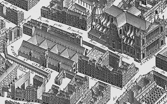 C’est entre ces deux étapes de construction que l’on voit sur le Plan de Turgot, de 1740 et sur cette gravure plus récente qu’ils ont célébré baptêmes et mariages dans cette église.