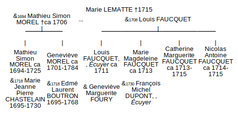 Marie épouse en seconde noces, le 9 septembre 1708, Louis FAUCQUET, commis à la douane, fils de Louis, concierge de l’Hôtel des Fermes du Roi où ils demeurent et de Marie de VAMBE. Ils ont très vite des enfants, Louis, naît vers 1711, Marie Magdeleine et Catherine Marguerite qui doivent être jumelles car nées toutes les deux, autour de 1713 et Nicolas Antoine qui voit le jour vers 1714. Le couple n’a pas quitté le Cloître-Saint-Nicolas.