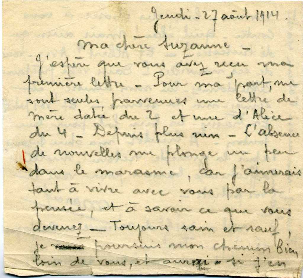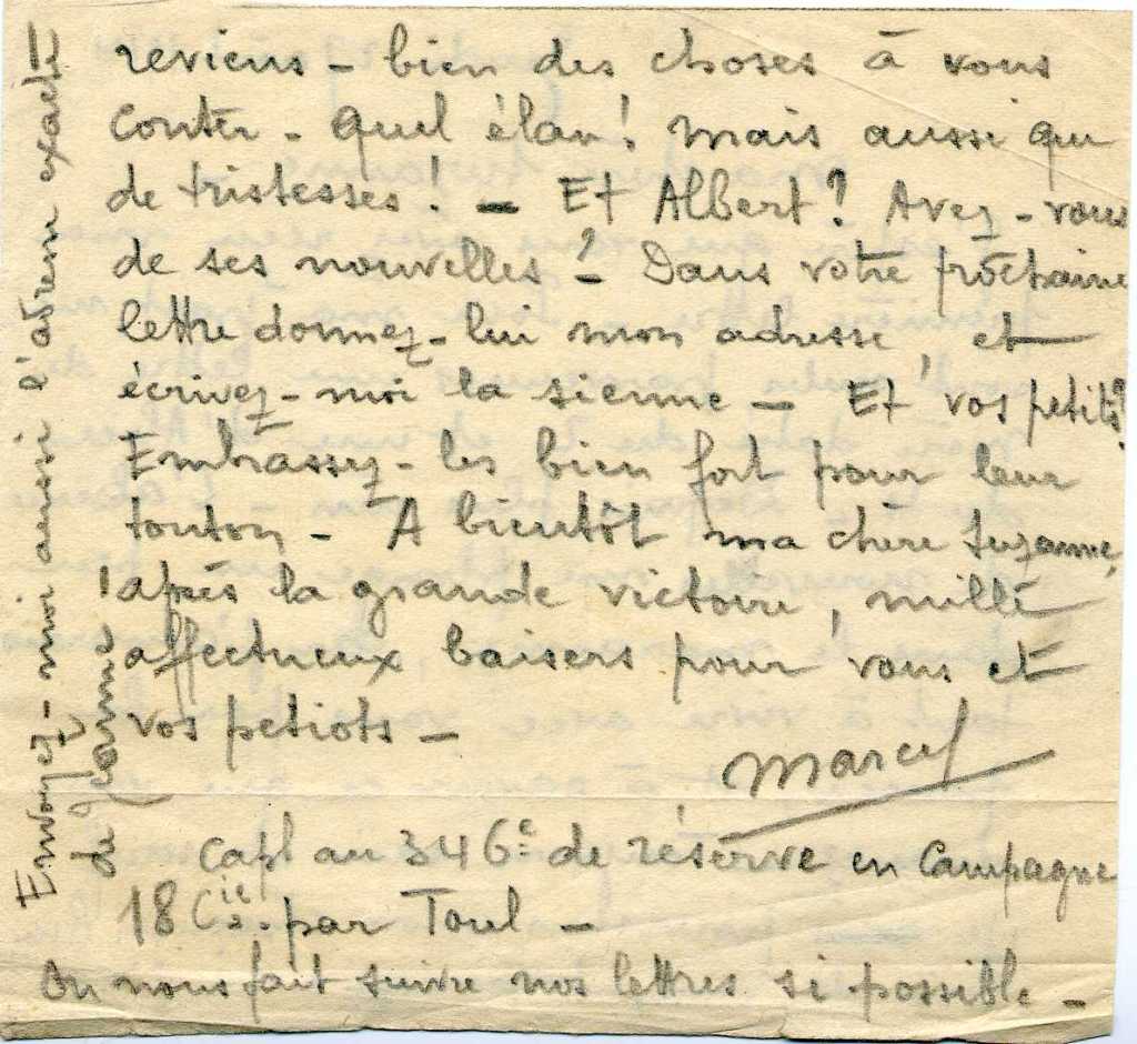 Mon arrière-grand-père tient donc seul, le cabinet dentaire, du moins au tout début de la guerre, parce que la famille a été très vite endeuillée. Marcel Emile, son plus jeune fils, est parti aussi au front, au 346e Régiment d’infanterie. Il écrit cette lettre à ma grand-mère, le 27 août.