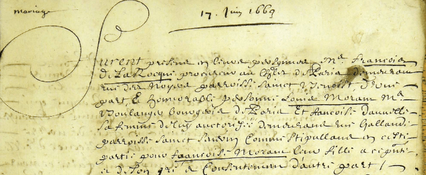 Le 17 juin 1669, François de La ROCQUE, procureur au Châtelet, fils de mes ancêtres, Jean de la ROCQUE et Denise PAPIN, contracte mariage avec Françoise MORANT, fille de Louis, marchand boulanger, bourgeois de Paris et de Françoise DANNELLE. Le futur époux habite rue des Noyers et la famille de la future épouse, demeure rue Galande.