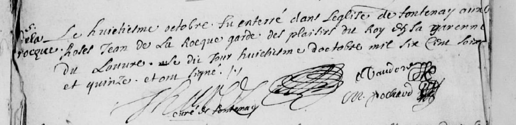 Mais tant lors de son inhumation le 7 octobre 1675, dans l’église de Fontenay-aux-Roses, que sur l’inventaire après décès de sa femme, en 1691, il est toujours dit garde des plaisirs du roi en la Varenne du Louvre et sa profession de greffier n’est pas mentionnée.