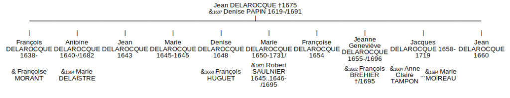 Le 9 juin 1637, elle épouse à Arpajon, Jean DELAROCQUE dont je ne connais pas les parents. Ils ont dix enfants, cinq garçons et cinq filles dont mon ancêtre Marie DELAROQUE, épouse de Robert SAULNIER dont j’ai déjà parlé rue de la Huchette. Les six premiers enfants sont nés à Fontenay-aux-Roses, de 1638 à 1650 et les quatre plus jeunes naissent à Châtillon entre 1654 et 1660. Il y a trois de leurs enfants dont je ne sais pas ce qu’ils sont devenus.