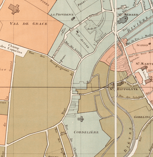 Les précisions apportées permettent de mieux situer la maison dans la rue, puisqu’elle dépend de la paroisse Saint-Médard. Elle se trouve donc dans la partie de l’actuelle rue Broca, en bleu sur la carte.