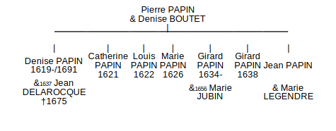 Denise PAPIN est née le 13 janvier 1619, à Arpajon dans l’Essonne, fille de Pierre PAPIN et de Denise BOUTET. Je lui connais deux sœurs et quatre frères. Je n’ai pas trouvé la naissance de son frère Jean dont on a connaissance par son mariage. Plusieurs généalogistes le disent né en 1638 mais à cette date, c’est clairement un second Girard qui est né et dans tous les actes le concernant Jean est bien prénommé ainsi. De même, on ne sait pas en fait, lequel des deux Girard s’est marié en 1656.