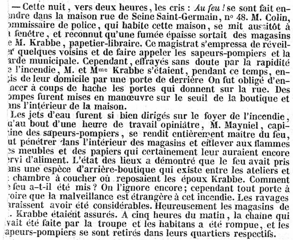 Dans son édition du 10 décembre 1836, Le Journal des débats politiques et littéraires, relate que vers deux heures du matin un incendie s’est déclaré, chez M. KRABBE, papetier-libraire, rue de Seine Saint-Germain, N° 48. Et c’est avec beaucoup de détails précis que l’accident est raconté.