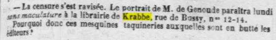 Coucou nous revoilà ! Et oui Pierre Henri KRABBE et Jeanne Angélique VIALAT ont également vécu dans cette rue. En 1834, ils étaient encore au 46 rue de la Montagne-Sainte-Geneviève. Dans la Gazette de France du 26 décembre 1835, j’ai trouvé cet entrefilet. Il s’agit sûrement de Eugène GENOUDE. Commençant à connaître mon libraire, je ne suis pas sûr que le portrait qui avait été censuré lui soit très favorable.