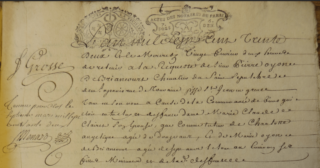 Le 20 février 1732, a lieu, rue de Touraine, paroisse Saint-Jean-en-Grève, l’inventaire après décès de Marie Claude CLAIRET, épouse de Pierre OYON de BRIANCOURT, Chevalier du Saint-Sépulcre.