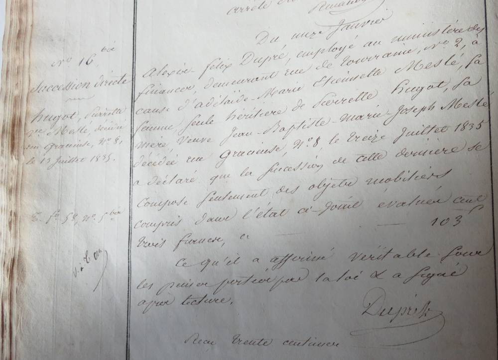 J’ai cherché, en vain, un éventuel inventaire après son décès, mais je doute qu’il y en ait eu un, au vu du montant de 103 F de sa succession.