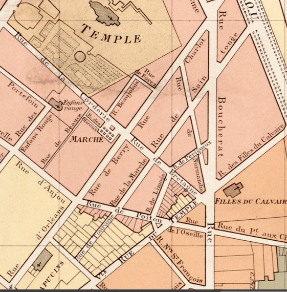 Sur ce plan parcellaire, on voit que la maison, à l’angle de la rue du Perche et de la rue de Touraine n’a pas de porte. Ces immeubles existent toujours, mais curieusement, la maison qui est au N° 2 sur ce plan et qui est donc celle où demeuraient mes ancêtres porte maintenant le N° 4 et il n’y a pas de N°2.