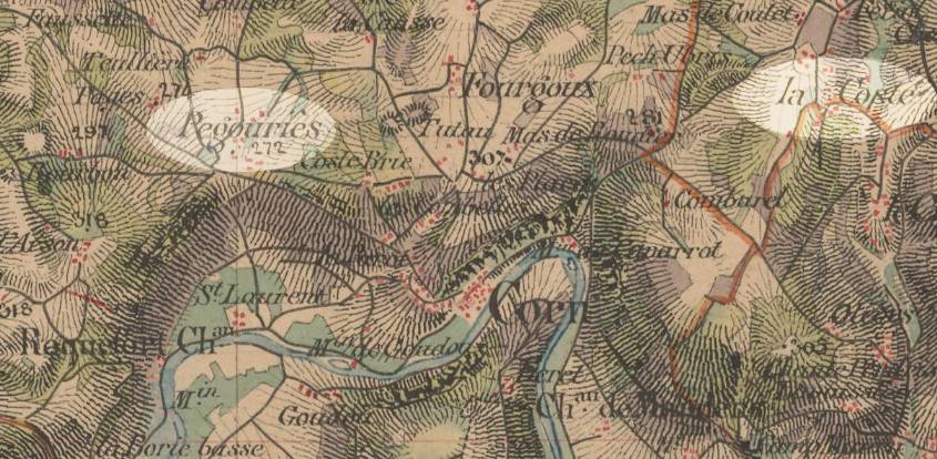Mais je n’ai trouvé aucune trace que ce village de Corn eut été un évêché, comme mentionné dans l’acte, et je n’arrive pas à localiser ce bourg et paroisse de « Pey » ou « Pez », qui en dépendrait. Par contre j’ai repéré sur la commune de Corn ou à proximité, deux hameaux qui m’ont bien intéressée, Pegouries et La Coste. J’ai l’intuition que ta mère, Marguerite de PECOUVI, pourrait bien s’appeler en fait Marguerite de PEGOURIE, étant tout simplement de ce hameau. Ce qui me conforte c’est que j’ai trouvé, sur Geneanet, le patronyme PEGOURIE à Corn et environ. Quant à ton nom composé VIALAS de la COSTE que je n’ai trouvé nulle part ailleurs, il viendrait bien de ce que tes ancêtres étaient des VIALAS, du hameau de La Coste. Je ne savais pas quelle variante retenir entre VIELAS, VIELLAS, VIALASE, VIALASSE…, variantes rencontrées tant dans les actes que par les signatures, pas toujours identiques de tes enfants. Mais je vais adopter VIALAS dans mon arbre car c’est uniquement, sous cette forme, que je l’ai vu aux alentours de Corn. Malheureusement je n’ai pas pu retrouver ton acte de naissance ni les actes de décès ou de mariage de tes parents et n’ai donc pas pu remonter plus haut car les archives de Corn ne démarrent qu’en 1784 et il n’y a pas de commune du Lot qui s’appelle Pey ou Pez.
