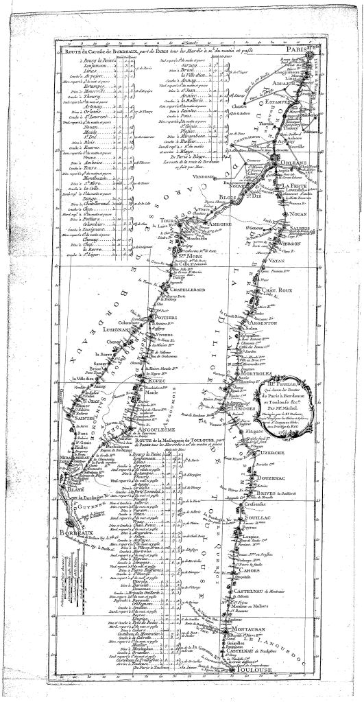 J’ai retrouvé cette carte qui indiquaient les routes et les relais, mais elle date de 1764, soit quatre-vingts ans après ton voyage. Mais avais-tu les moyens financiers d’emprunter une diligence et de payer l’hébergement à chaque relai ?