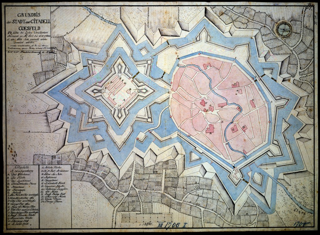 Cette carte du XVIIe siècle montre la ville de Coesfeld et la citadelle de Ludgerusburg, construite devant ses portes à partir de 1654. Le prince-évêque Christoph Bernhard von Galen a choisi Coesfeld comme ville de résidence parce qu’il était en conflit avec Münster. Après la mort du deuxième successeur de Galen dans la charge de prince-évêque, alors que le Sedis était vacant, le chapitre de la cathédrale de Münster fit démolir l’ensemble en 1688. Quant aux fortifications qui entourent la ville, ce n’est que pendant la guerre de Sept Ans (1756-1763) que les fortifications furent détruites sur ordre des Français.