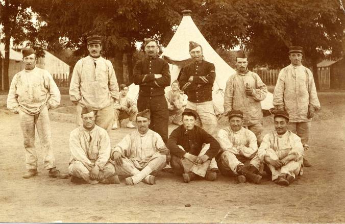 Ensuite, l’essentiel de ce que j’ai pu découvrir sur lui, provient de sa fiche matricule. Je peux l’imaginer un peu grâce au signalement et à la seule carte que j’ai de lui, écrite à ma grand-mère, lors de son service militaire, en 1905. Il est le quatrième, debout, en partant de la gauche.