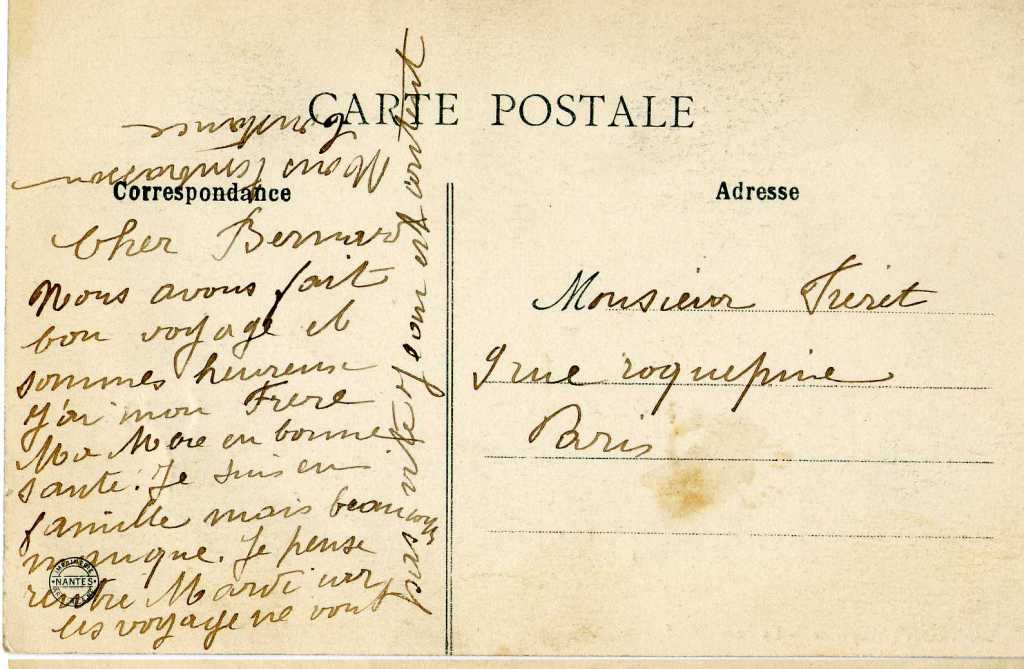 Est-il resté plusieurs années, chez ce dernier ? J’ai une carte, envoyée de Colombiers, par ma grand-mère à mon grand-père, resté à Paris. Cette carte n’est pas datée mais se situe entre 1911, naissance de mon père dont elle parle et la mobilisation en 1914, puisque mon grand-père est chez eux à Paris. Ma grand-mère écrit qu’elle a vu son frère.