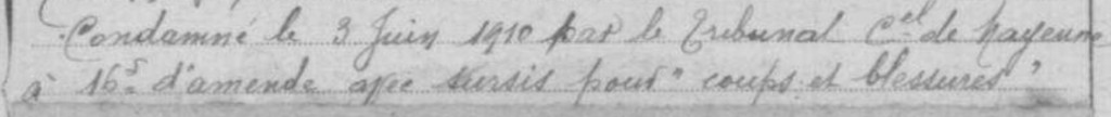 Sur sa fiche matricule, je découvre qu’il a été condamné, le 3 juin 1910, pour « coups et blessures ». Sortie un peu trop arrosée ou dispute qui se termine mal ?