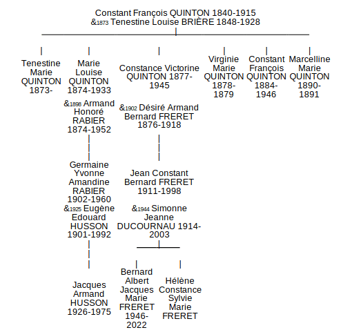 Il ne lui reste donc comme famille, que sa nièce, Germaine RABIER et son neveu, Jean FRERET, mon père. Mais je n’ai trouvé aucune carte écrite par lui dans celles, précieusement gardées. Communiquait-il ses changements d’adresse ? J’en doute et puis la guerre ne facilitait pas les rencontres, surtout pour mon père dont la maman était très malade et aveugle. Je n’ai hélas pas de photos de groupe pour le mariage de mes parents, en 1944, mais je doute qu’il soit venu. Voyait-il, de temps en temps sa filleule et son époux qui me paraissent très sympathiques, ici avec ma grand-mère ? Je n’ai aucun souvenir de les avoir rencontrés, enfant, alors qu’ils vivaient en région parisienne. Elle aurait sûrement évoqué son parrain avec nous. Germaine est décédée quand j’avais 13 ans. Je n’ai pas connu, non plus, son fils, Jacques Armand HUSSON, né en 1926 et décédé en 1975. J’ignore s’il s’est marié et a eu des enfants.
