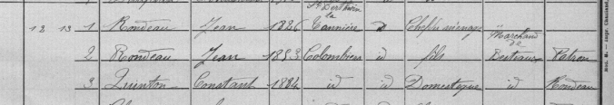 J’ai bien sûr cherché à savoir si Constant est resté plusieurs années chez JAMOTEAU. Et bien non, ni lui, ni les deux autres ne sont encore domestiques, chez l’un des JAMOTEAU, sur le recensement de 1911. Sont-ils partis, de leur plein gré, chercher du travail ailleurs ou bien est-ce leur patron qui n’a pas voulu poursuivre avec ces domestiques bagarreurs ? C’est au Bourg de Colombiers que je retrouve Constant où il est domestique chez Jean RONDEAU, marchand de bestiaux, son patron. Le père de celui-ci, âgé de 85 ans vit avec eux.