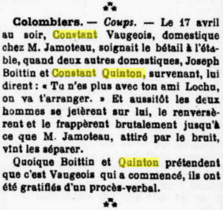 On ignore ce qui a pu déclencher la violence de ce règlement de compte entre jeunes. Constant n’aura pas d’autres condamnations par la suite, du moins mentionnées sur sa fiche matricule et je n’ai rien trouvé ultérieurement sur Retronews. Bien sûr, j’ai cherché à savoir qui sont les protagonistes. Cet article m’apprend que Constant est alors domestique, chez un Sieur JAMOTEAU, cultivateur. Il y a trois JAMOTEAU, cultivateurs, qui ont pu être leur employeur, Aimable Louis Victor, né en 1870, César Charles, né en 1873 et Victor Joseph, né en 1874. Les deux derniers sont frères. Je pencherai pour que ce soit chez Victor Joseph que Constant travaille car ils ont un lien familial. Celui-ci est cousin par alliance du père de Constant. En effet il a épousé Marie Modeste BAILLEUL, fille de François BAILLEUL, second mari de Marie Françoise FORTIN qui a épousé en première noce, Julien QUITON, tous deux grands-parents de Constant.