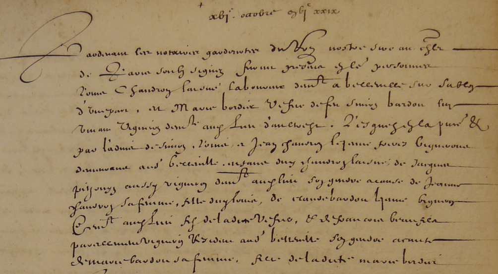 Marie BORDIER a apporté aussi des terres en labour et des vignes. Le 17 novembre 1629, un bail de location est passé entre Louis et Nicolas LECOUSTEUX, un de mes ancêtres. Louis lui loue « une maison contenant un corps d’hostel, cour, jardin adt Belleville et à la Grande rue en laquelle était naguère demt Marie Bordier à présent femme du ddt Chaudron et 3 arpents et un quartier tant en terre que vignes en plusieurs pièces […] ». Les conditions sont les suivantes : « continuer à sa charge d’entretenir ldte maison de menues réparations […]. Item de labourer ldtes terres et les fumer bien et dûment comme il appartient. Item de labourer et fumer les vignes pendant ldt temps comme vignes de vigneron et en fin de temps rendre le tout en bon état desquelles vignes le preneur sera tenu de mettre par chaque an un quarteron d’échalas et excepté à ldte vigne en friche qu’il sera tenu de faire mettre aucun échalas mais seulement sera tenu d’y faire un labour par chaque an. Item s’est le ldt bailleur réservé par chaque an ldts fruits qui proviennent de 2 arbres faisant partie de ceux qui sont dans le quartier de terre et vigne en friche, à choisir ldts 2 arbres tel qu’il plaira adt bailleur ».