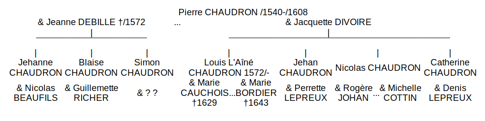 Pierre se remarie avec Jacquette DIVOIRE, originaire de Belleville avec qui il aura quatre enfants, dont l’aîné, Louis, mon ancêtre. L’acte de renonciation à une succession, daté du mercredi 27 février 1608, permet de déduire que Pierre vient de décéder. Ses petites-filles, Geneviève et Anne, issues des enfants de son premier mariage « renoncent aux biens que les femmes eussent pu appréhender de leur mère et de leur père« , en faveur de leur oncle Louis, premier enfant du remariage de Pierre avec Jacquette DIVOIRE, se disant créancier de son père. Cette dernière est décédée en 1612.