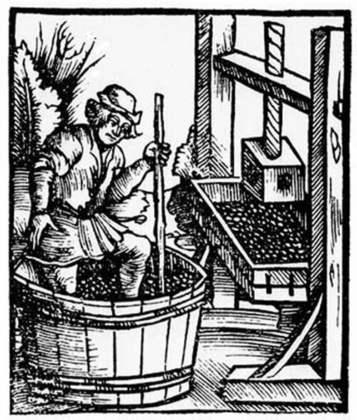 - Puis quand les douils arriveront au cellier, la vendange sera versée dans un grand cuvier et aussitôt, les raisins seront foulés au pied. C’est un travail très dur qui libère peu à peu le jus. Au bout d’un certain temps, les fouleurs pataugent dans un liquide visqueux où surnagent les pellicules, les pépins, les grappes. À ce moment seul, le haut du corps émerge mais la tête doit absolument dépasser de la cuve pour ne pas risquer de s’asphyxier avec le gaz carbonique qui se dégage. Pour les encourager et rythmer leur travail, un musicien jouera des airs entraînant avec son violon et nous l’accompagnerons de nos chants. C’est un moment très joyeux et très souvent on se met à danser autour.