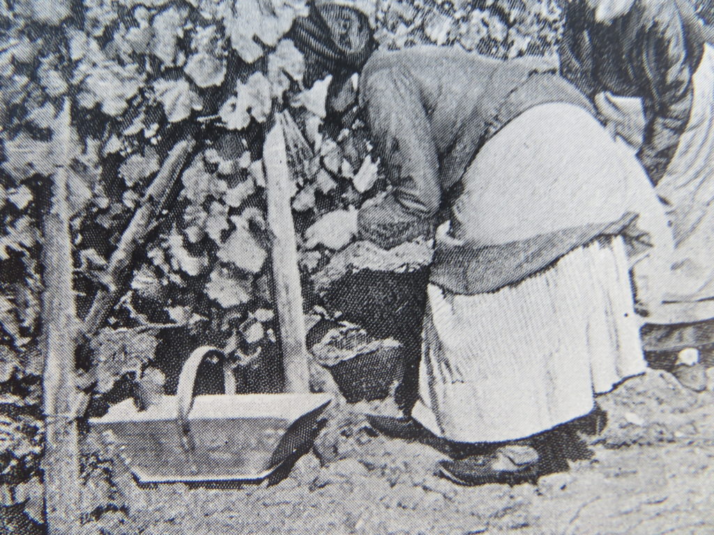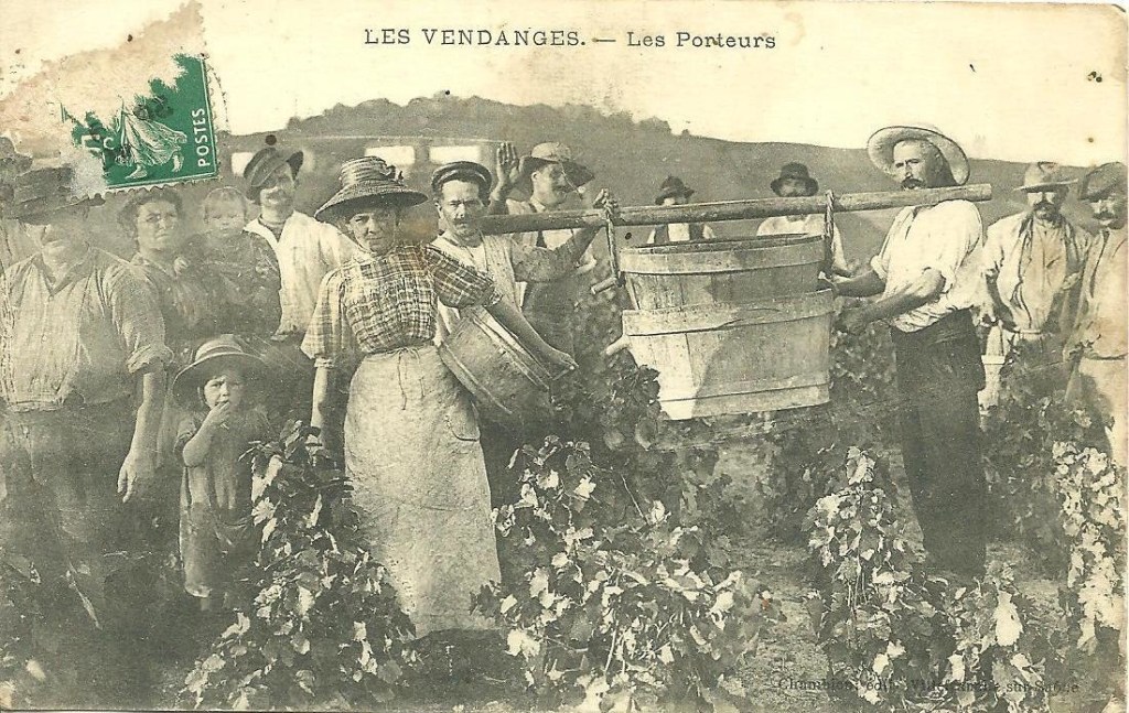 - Au fur et à mesure de la récolte, les hommes circulent dans les rangs des vignes, avec leurs hottes – de grands paniers en osier et en bois -, fixées sur leur dos avec des lanières en cuir. Les femmes versent leurs baillots remplis, dedans.