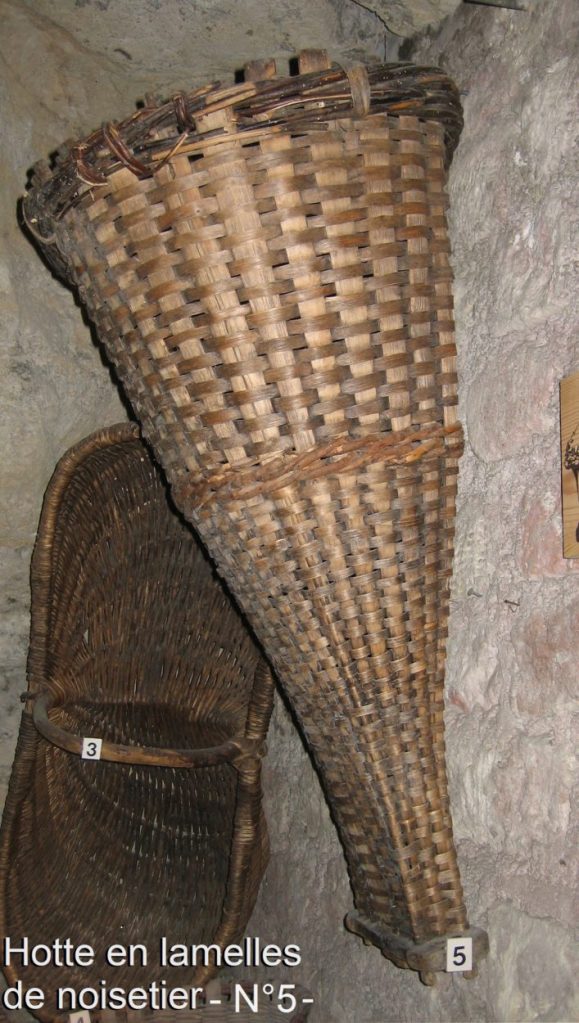 L’osier utilisé pour fabriquer les hottes est tressé sur une armature constituée de verges de bois, par exemple des scions de peuplier ; mais on en trouve aussi faites avec des lamelles de noisetier. De forme plus ou moins conique, la hotte est pansue, arrondie vers l’extérieur et plate pour la face en contact avec le dos du porteur. Sa base est arasée et fermée par un fond en bois permettant son transport sur un porte-hotte. La partie dorsale est souvent débordante vers le haut, à la hauteur de la tête. (photo Coll. CEF, Musée du Vin Paris)