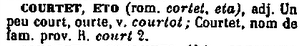 COURTET / CORTET est un nom très répandu un peu partout en France. Geneanet nous dit : « Surtout porté dans le Morbihan et dans l’Yonne, c’est le plus souvent un sobriquet appliqué à celui qui est petit, court sur pattes. En Bretagne, on peut cependant penser aussi à une variante de « courtois ». Je l’ai trouvé dans le « Tresor dou Felibrige », le dictionnaite provençal-français.