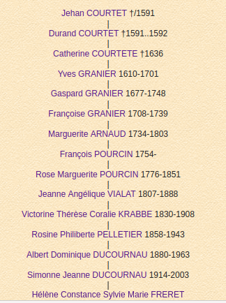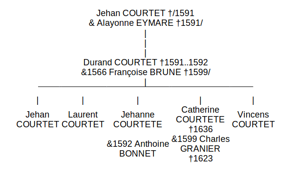 J’ai découvert ce couple, par le contrat de mariage de leur fille, mon ancêtre, Catherine COURTETE, à Manosque, le 31 octobre 1599, avec Charles GRANIER, fils de Loys et de Marguerite BLAYNE. Durand COURTET est déjà décédé mais Françoise BRUNE est présente et Catherine a pour témoin, son frère Jehan.