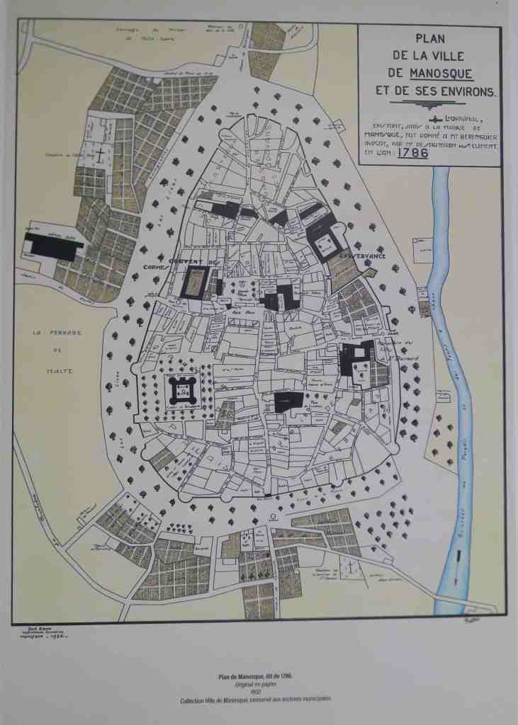 La ville de Manosque était entourée de ses remparts, comme on la voit encore sur ce plan de 1786. Elle était divisée en quatre quartier. Durand voulant être enterré dans l’église Saint-Sauveur, on peut penser qu’il habitait le quartier des Ebrards (Hebrears sur cette carte) qui se situe en bas et à droite.