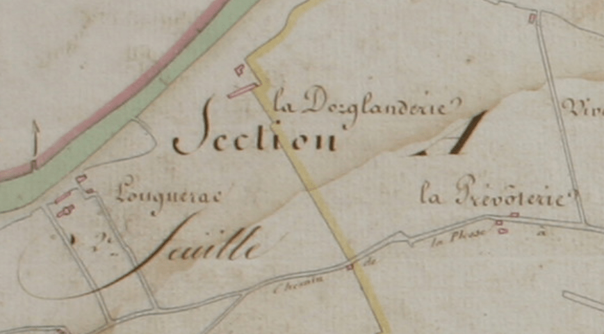 À défaut d’avoir trouvé l’acte de vente, j’ai retrouvé mention de ces maisons car Jean François Sylvestre et Anne Louise les ont hypothéquées en garantie de la vente qu’ils ont faite, le 8 janvier 1828, des biens, situés à La Bonneville. provenant de la succession de Louis LACAUVE, le père d’Anne Louise. Sont ainsi décrites :« deux maisons à usage de cuisine de fonds en comble, cour devant et derrière autant qu’il en dépend et un jardin potager tenant à la cour de devant, contenant environ six ares douze perches, le tout situé triage de Longrac borné par le chemin de l’église des Moitiers à Longrac, les héritiers Gilles Guillotte, Félix Lucas et autres. » Le jardin doit être étroit et tout en longueur s’il borne jusqu’au chemin vers l’Église qui passe par La Prévoterie où ils possèdent « un champ de terre en labour, planté de pommiers contenant environ treize ares vingt six perches, borné par une voie, Jean Roublot et autres. » qu’ils ont dû aussi hypothéquer, le temps que la vente soit achevée.