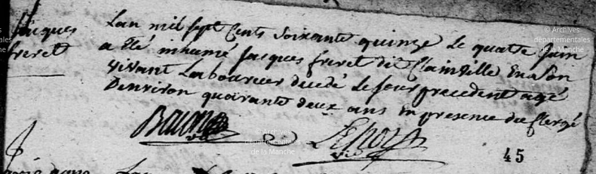 « Sont présents Catherine JEAN veuve de feu Jaques FRERET, ladite comparant demeurante en ladite commune de Picauville, grabataire mais saine d’esprit, jugement et entendement d’une part et Jean FRERET son fils cultivateur, demeurant même commune d’autre part. »