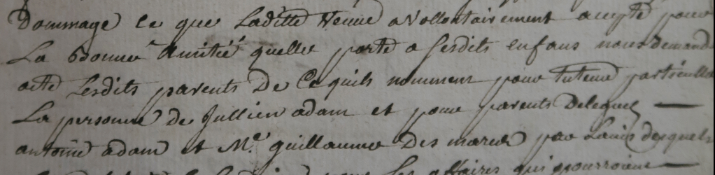 Il est le dernier d’une fratrie de quatre enfants mais il ne connaîtra qu’un seul de ses frères et sœur, les trois autres étant décédés avant sa naissance. Et le 14 novembre 1741, il n’a que huit ans, quand il a le chagrin de perdre son père. Sa mère est nommée, par l’acte du 26 février 1742, tutrice de ses deux enfants mineurs qui ont pour tuteur particulier Julien ADAM et pour parents délégués, Antoine ADAM et Guillaume DESMARES. Les deux premiers sont des cousins issus de germain du côté paternel et le second est un oncle par alliance du côté maternel.