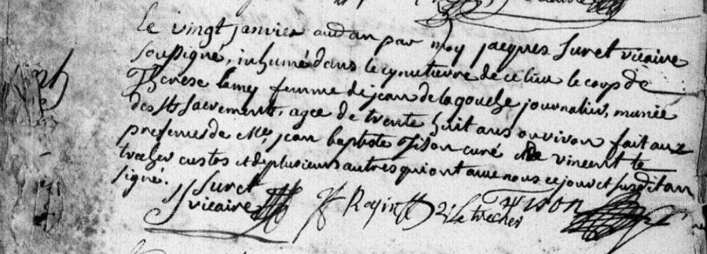 Mais ce n’est pas étonnant car il y a eu très tôt une école à Picauville, y compris pour les filles. J’ai trouvé un acte notarié du 28 août 1699, fort intéressant. « Fut présente Jeanne Susanne LEPORTOIS de present maitresse d’escolle en lad(icte) paroisse de Picauville laquelle a donné la somme de deux cent quatre vingts livres, contenue en une obligation du fait de Jeanne MALASSIS et icelle mise aux mains de M(essir)e Pierre LASTOLEY p(re)b(st)re curé dud(ict) Picauville doyen d’Orglandes pour en a… un fonds qu’elle destine pour aider à fonder une escolle de filles en lad(icte) paroisse de Picauville parce que neanmoins lad(icte) LEPORTOIS s’est réservée l’usufruit sa vie durant dud(ict) fonds ainsy qu’à Marie Jeanne LEPORTOIS sa sœur en faisant la ditte fonction de maîtresse d’escolle à laquelle elle sera préféré… ». Je ne sais pas quand l’école pour les filles a réellement été créée mais il est fort possible que Anne Marie Marguerite en ait profité.