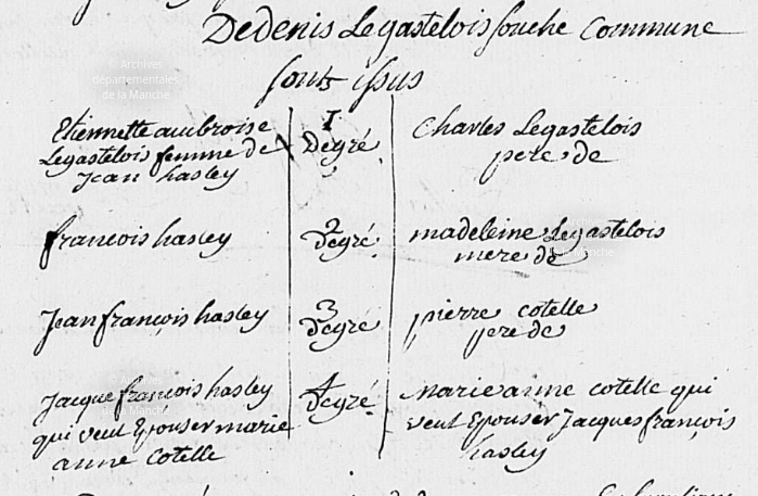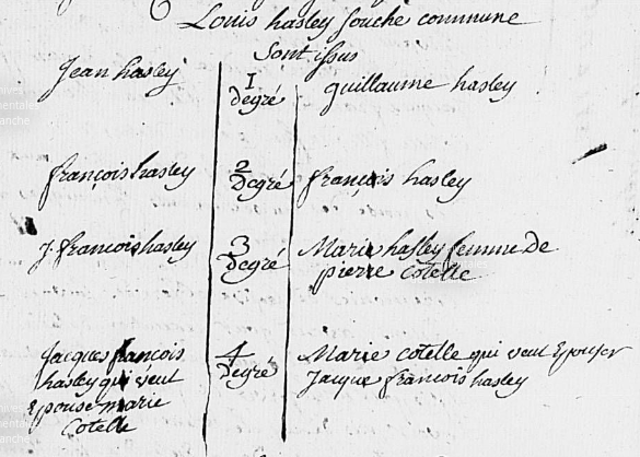 « Jacque François HASLEY, laboureur de cette paroisse, âgé de vingt six ans […] a dit que depuis plus de trois ans, il recherche en mariage la suppliante, qu’il savait sa parente par l’usage de s’appeler cousins sans en connaître la généalogie mais que depuis un certain temps, il scait que de… »