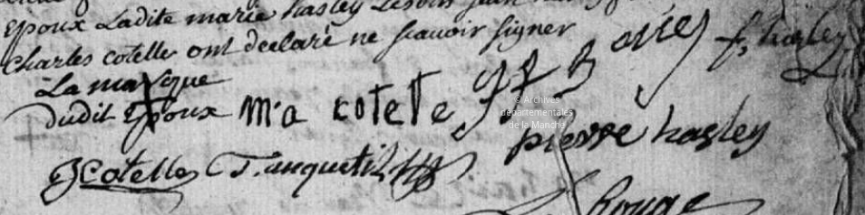 « Marie Anne COTELLE fille de feu Pierre et de Marie HASLEY […] depose qu’elle ne peut aujourdhuy rompre une promesse qu’elle a donnée il y a plus de trois ans au suppliant, sans un grand danger de ne point trouver un party qui luy convienne autre que le suppliant n’ayant pour toute dotte que cinq livres de rente et âgée de plus de vingt quatre ans. »