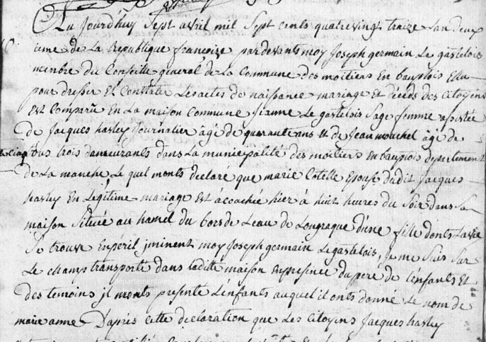 - Marie Anne est notre second petit ange, née le 6 avril 1793 et trop vite envolée, le jour même, comme le raconte son acte de naissance-décès. C’est depuis le 27 décembre 1792 que l’on ne déclare plus les naissances à l’église mais en mairie. Le lendemain matin, ce sont Jeanne LEGASTELOIS la sage femme, assistée de Jacques François et de Jean MOUCHEL, un voisin, qui sont allés déclarer que j’ai accouché la veille à huit heures du soir dans notre maison « située au hamel du bord de l’eau de Longraque d’une fille dont la vie se trouve en péril imminent ». Joseph Germain LEGASTELOIS, membre du Conseil général de la Commune est aussitôt venu à la maison pour constater la naissance de l’enfant et enregistrer le prénom qu’on lui a donné.