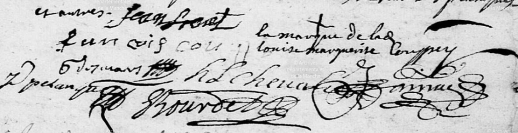 Les papiers étaient peu nombreux, outre leur contrat de mariage, il y avait plusieurs quittances qui lui ont été « expediez par le Sieur d’Hildermisse, agent des affaires de la Marquise de Bellefond ». Celle-ci est sûrement l’une des filles de Bernardin de GIGAULT, marquis de Bellefonds, seigneur de l’Îsle-Marie à Picauville, né en 1630, mort le 4 décembre 1694 à Vincennes, maréchal de France en 1668. Jean a donc eu des dettes envers la Marquise dont les quittances font foi qu’il les a remboursées.