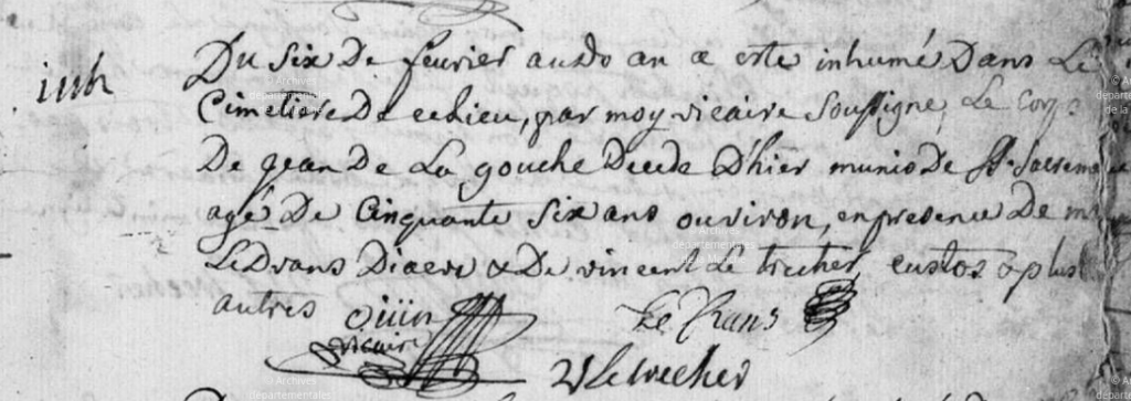 Jean a survécu six ans à Marie Thérèse qu’il a rejointe dans l’au-delà, le 5 février 1757, âgé de 55 ans. Sur certains actes son nom est écrit, comme ici, « de LA GOUCHE », mais je doute fort qu’il puisse s’agir de la particule « de » nobiliaire qui se serait ensuite perdue.