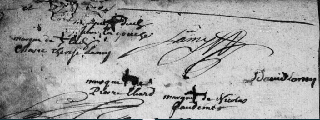 Le 4 mai 1751, je me suis remarié avec Jeanne JEANNE, âgée de 21 ans, fille de feu Guillaume et de Marie Magdeleine LEGASTELOIS. Elle avait pour témoins, sa mère et sa cousine, Germaine Marie Charlotte LEGASTELOIS, épouse de Jean JEANNE et moi, j’étais assisté par Jeanne LEMONNIER, épouse de Louis LAGOUCHE, mon cousin germain. Auparavant, nous étions allés chez le notaire de Picauville pour passer un contrat de mariage que j’espère tu réussiras à retrouver.